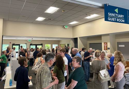 - When you enter the Lobby, you'll see the coffee station close to the sanctuary entrance. Feel free to bring your own coffee tumblers with lids inside. Disposable cups with lids are provided.